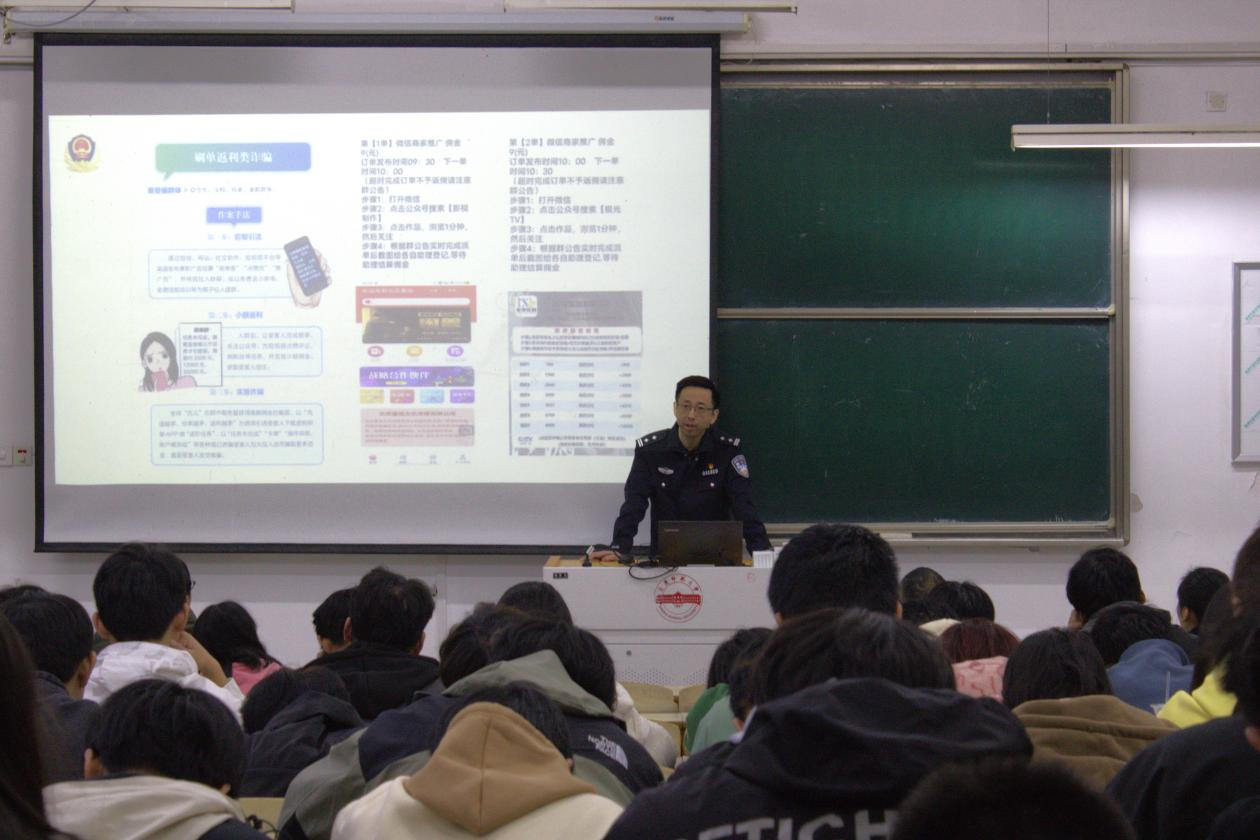 刷单返利类诈骗、虚假网络贷款类诈骗、网络游戏产品虚假交易类诈骗……陶剑详细列举了常见的电信网络诈骗类型,并结合一个个鲜活的具体案例,深入剖析了诈骗分子的作案手法和诈骗过程,向学生揭秘了网络诈骗的种种套路。“诈骗分子往往以小额返利作为诱饵,诱导受害者不断投入资金,最终卷款消失。”提及网络刷单现象时,陶剑强调,大学生切勿贪图小利,以免落入诈骗陷阱而自食其果。