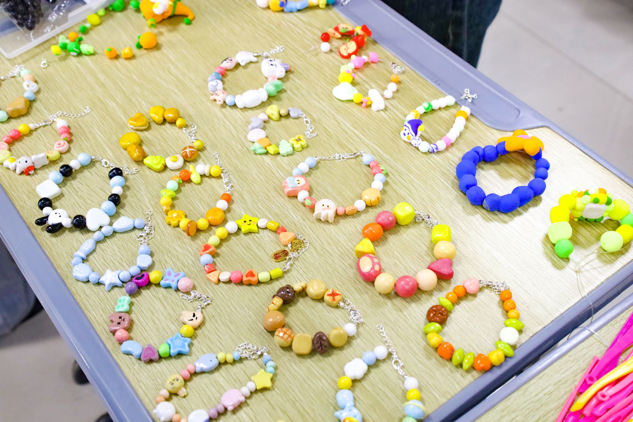 白色粘土揉搓为小球,橙色粘土捏成帽子形状,剪刀与镊子被用于压刻褶皱……在动画专业2024级的高沁怡的桌上,摆放了诸多暖色调的小型粘土“橙子”“柿子”和“南瓜”。谈及创作理念,她坦言现在正处于丰收的深秋季节,自己将相关元素进行艺术加工,把“秋”留在手链里。与此同时,由粘土制作的机器人、银灰色零件、白色与黄色相叠的荷包蛋、彩虹与白云、行星与弯月等串珠“环环相扣”,学生们“各显神通”,将天马行空的想象融入手链。