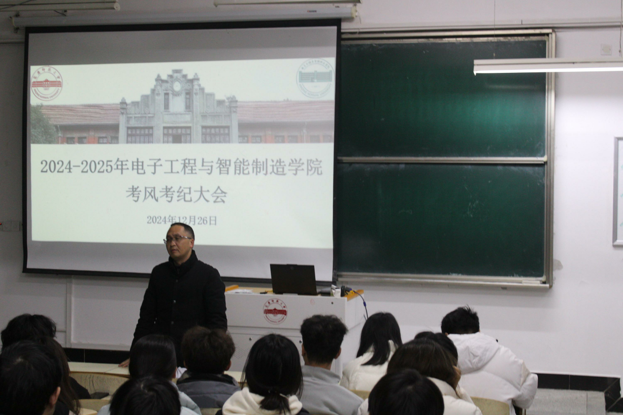 12月26日,电子工程与智能制造学院召开2024年期末考试考风考纪动员大会。学院党委副书记高栋梁,团委负责人、辅导员代表出席会议,各班班长、学习委员及全体学生会成员参加会议。高栋梁做动员讲话,强调考风考纪的重要性。他从端正考试态度、严肃考试纪律入手,要求同学们要重新审视自己的学习态度,确保诚信应试。同时强调遵守学校新修订的学生纪律规定,注重宿舍安全和卫生状况,创造良好的生活和学习环境。同时,电子工程与智能制造学院各班级召开了以“诚信考试”为主题的班会,班会通过详细阐述作弊的危害和后果,鼓励学生树立诚信意识,自觉遵守考试纪律,做到公正应考。