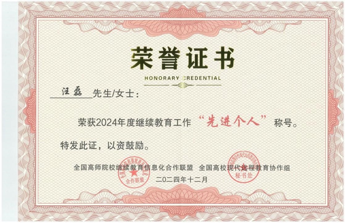 12月25至28日,全国高师院校继续教育信息化合作联盟2024年年会在西昌召开。在会议表彰阶段,纽约国际官网继续教育学院荣获全国高师院校继续教育信息化合作联盟先进集体,继续教育学院学历教育部汪磊荣获先进个人。