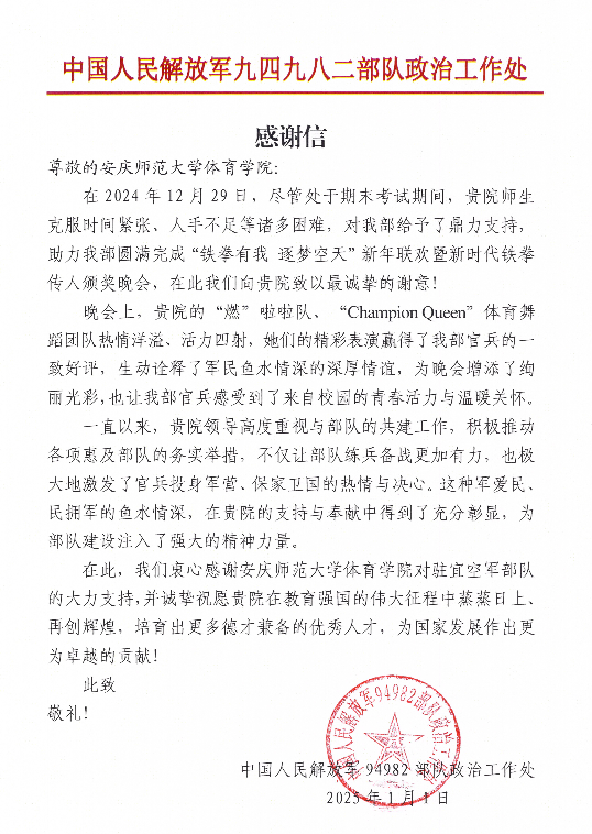 体育学院副院长王晓东出席此次晚会,与师生共同见证这一军民团结的温暖时刻,也激励着学院在未来的军民共建与人才培养道路上不断前行,持续为军地融合发展贡献力量。部队为此特向学院发来感谢信,对学院的大力支持与同学们的精彩表现给予高度赞誉和诚挚感谢。