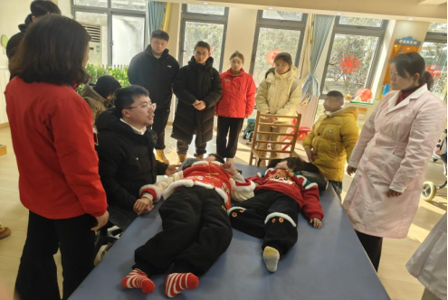 参观过程中,康复师储医生在康复室内在为一名患有脑瘫的儿童进行康复训练,康复师们耐心地指导着每一个孩子,根据他们的具体情况制定个性化的康复方案。看到康复师们的专注神情以及孩子们在康复训练中所展现出的坚韧意志,师生深受触动。在与康复师的交流中得知,近年来福利院不断探索创新复健模式,采取“康教医”一体化的治疗方式,以儿童存在的问题为导向,精准识别、精准评估、精准施案,综合评估儿童发育行为,制定适合不同孩子的康复计划。通过努力,许多孩子在身体功能和认知能力上都有了显著进步,部分孩子已经能够融入社会生活。