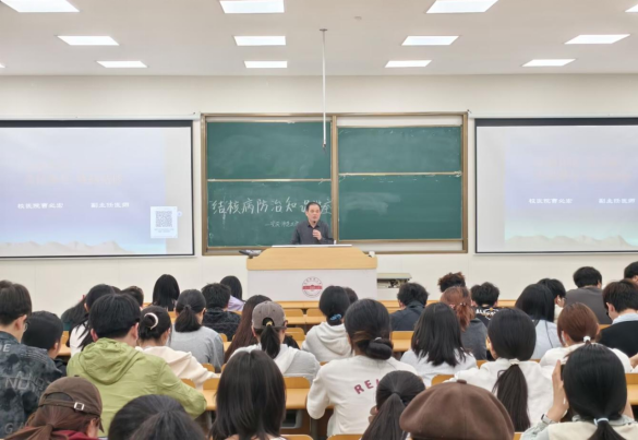 曹必宏凭借丰富的临床经验,从结核病的发病机制、传播途径等基础知识讲起,结合详实的案例,生动阐述了结核病的具体危害和积极防治的重要意义。他指出,结核病作为一种严重威胁人类健康的传染病,在校园等人群密集场所传播风险较高,提醒同学们务必引起高度重视。他强调,同学们在日常生活中要关注自身健康状况,一旦出现咳嗽、咳痰等疑似症状,应及时就医筛查。在传播途径和预防措施方面,曹必宏详细介绍了结核病通过空气飞沫传播的特点,并分享了一系列实用的预防方法,如保持室内通风、加强体育锻炼、及时接种疫苗等。