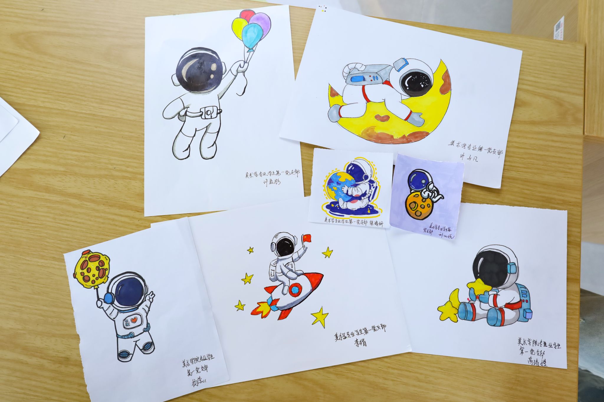 工笔画细描航天员的轮廓、油画刀刮擦出航天服的金属光泽、充满萌趣的月球“动态式”点缀……一幅幅独具匠心的“航天人”画像在学生手中诞生。美术学专业2023(1)班的李娟在笔下的“航天人”的“手中”插入五星红旗,“画到指尖触碰国旗的瞬间,我突然理解了什么是‘把使命握在手心’。”她表示,“作为当代青年,我们更应该怀揣爱国之心,为国家发展贡献青春力量。”