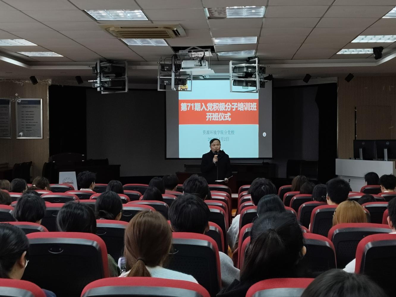 4月2日,资源环境学院党委在F411举行第71期入党积极分子培训班开班仪式。资源环境学院党委书记夏斐出席并致辞,第71期入党积极分子培训班全体学员参加。仪式由资源环境学院党委副书记黄建平主持。