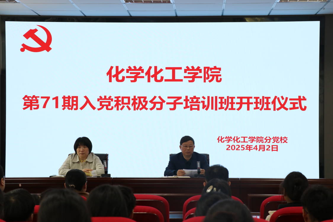 4月2日,化学化工学院举行第71期入党积极分子培训班开班仪式。化学化工学院党委书记李新建、各学生党支部书记和全体学员参加开班仪式。仪式由化学化工学院党委副书记、纪委书记鲍青燕主持。