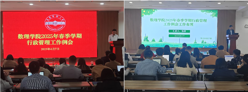 4月7日,数理学院在I楼401报告厅召开2025年春季学期行政管理工作例会部署年度重点工作。数理学院党委书记陆健,院长张海,副院长易明芳,党委副书记、纪委书记彭芳珍,副院长殷周平,各办公室工作人员、辅导员参会。会议由张海主持。