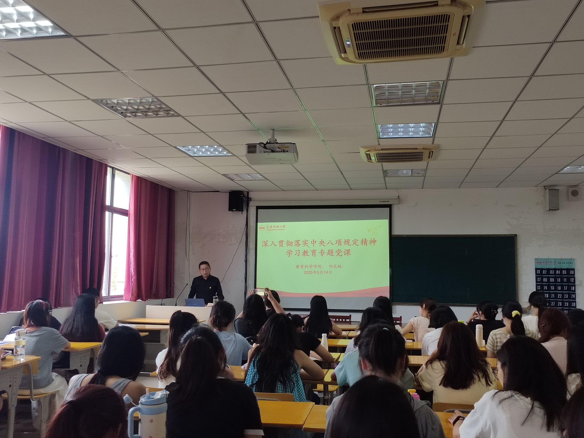 5月14日,教育科学学院党委书记何孔蛟在J305会议室以《深入贯彻落实中央八项规定精神 以优良的作风奋力答好新时代的青春答卷》为题,为学院第71期入党积极分子讲授深入贯彻中央八项规定精神学习教育专题党课。