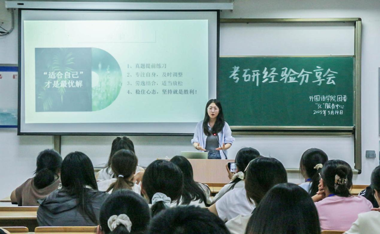 外国语学院一直高度重视学生考研工作,此次经验分享会旨在为同学们搭建学习交流平台,充分发挥优秀学子的榜样引领作用。通过本次分享会,同学们收获了实用的考研经验,对考研流程和备考方法有了更清晰的认识,也进一步坚定了考研信心。(撰稿:倪湘 樊陈慧 宋晚月    摄影:杨再冉 蒋雨轩   编辑:江伟    审核:何媛君 赵丽丽)