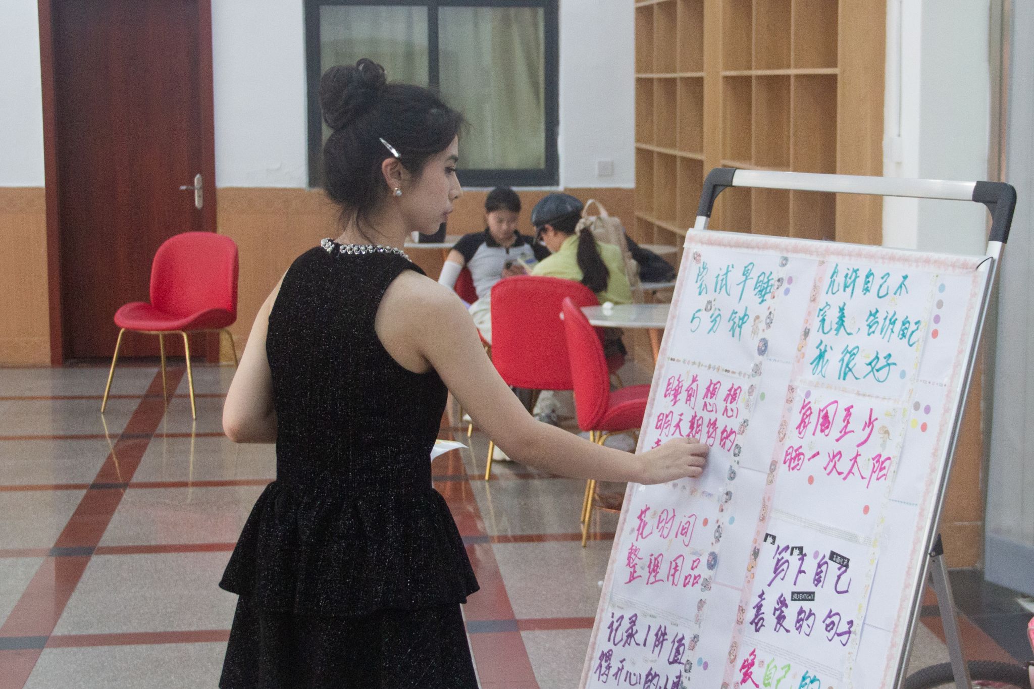 读一本好书、给家人拨通电话、为自己准备一份仪式感满满的早餐……在“爱自己的 n 种方式” 主题展板前,2024 级中国语言文学类专业(4)班毕馨纯与同伴们正用彩色波点标识出 “爱己地图” ,逐渐密集的波点如同星星之火,点燃现场学生探索自我关怀的热情。这种充满创意的互动形式,将抽象的心理健康理念转化为可触摸、可记录的日常实践,引领大家在点滴行动中养成自尊自信自爱的心理品质。