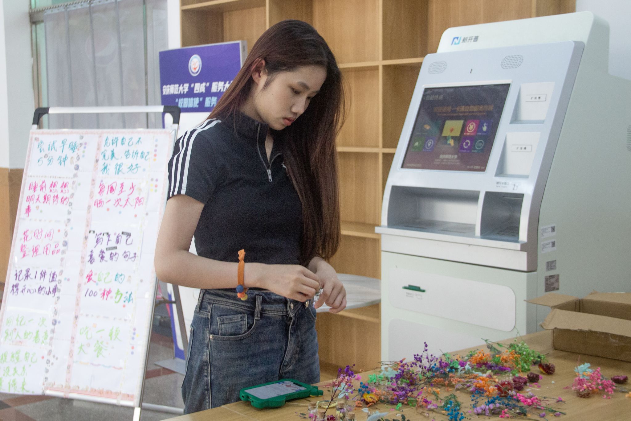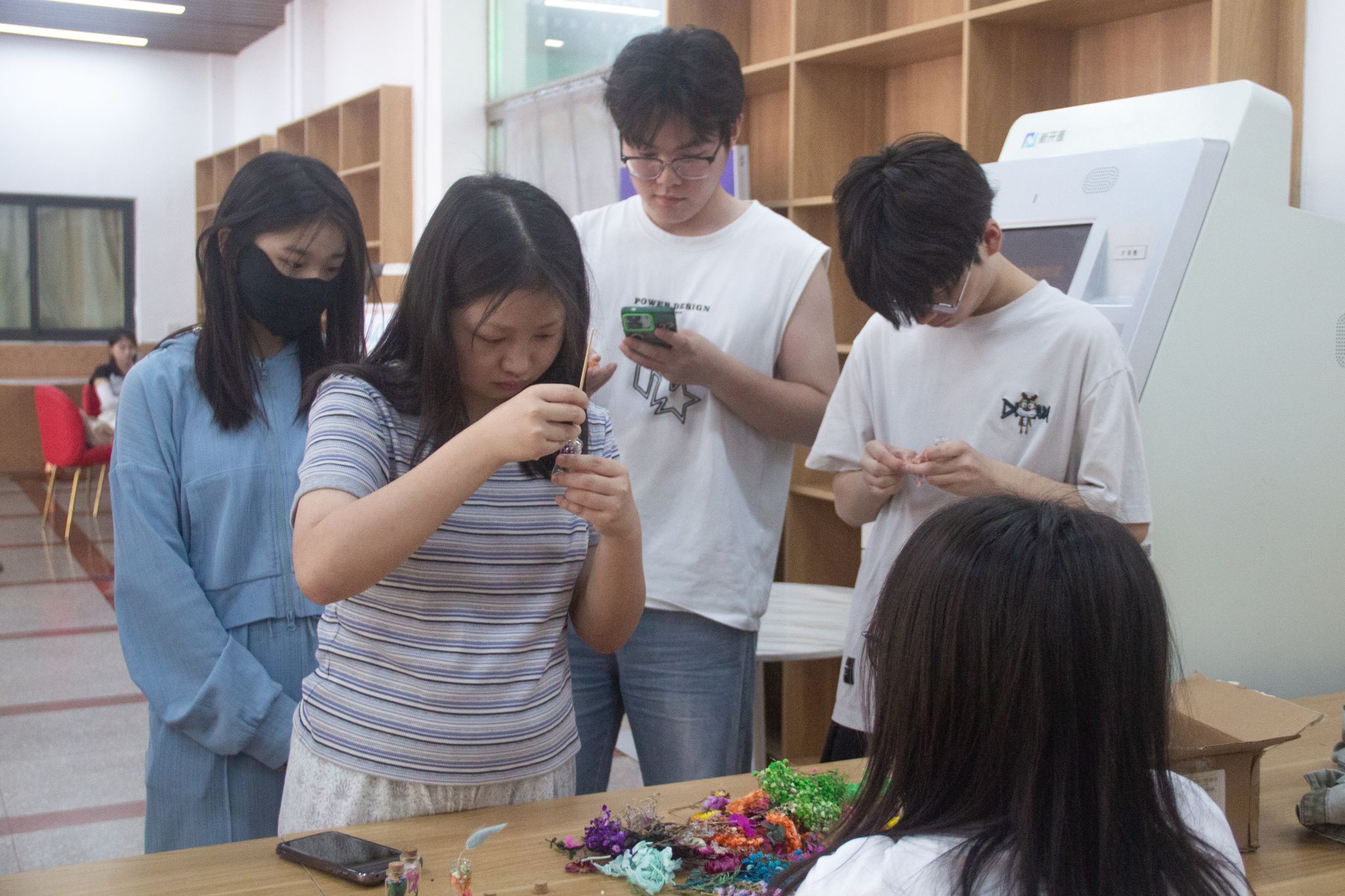 活动现场,长桌上整齐陈列着波点贴、木塞玻璃瓶与绘画纸笔,一场别开生面的 “心灵收纳” 之旅悄然开启。学生们将干花与书写情绪状态的纸条封存于玻璃瓶,在折叠文字与摆放花束的过程中释放压力情绪。2024 级中国语言文学类专业(1)班唐欣分享道:“当压抑的情绪随着干花被封存进透明容器,仿佛看到那些隐秘的心事正在阳光下慢慢舒展。这种充满仪式感的表达,让我学会理性与情绪对话。”