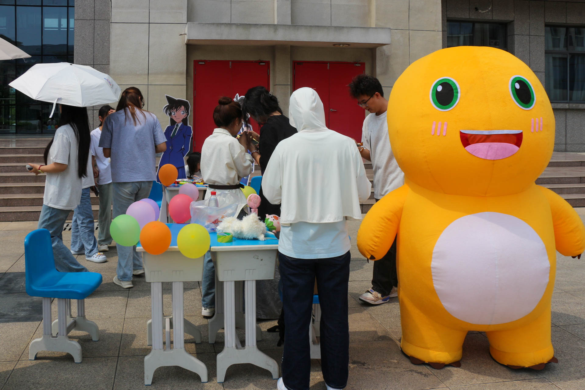 暖心拥抱·治愈瞬间。巨型卡通玩偶成为全场最受欢迎的“情感加油站”。工作人员化身柔软可爱的萌宠,张开双臂送出无声的关怀。同学们纷纷驻足拥抱——有人闭眼微笑轻拍玩偶后背,有人俏皮比心合影,还有人将脸颊埋进绒毛长舒一口气。“这个拥抱像有魔法,压力瞬间消散了。”2024级外国语言文学类6班王馨羽轻抚玩偶耳朵感叹道。