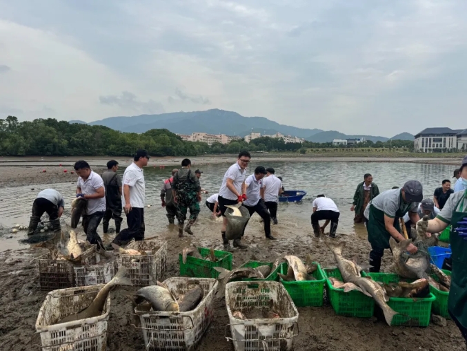 专业捕捞人员撒网收鱼,志愿者们捕捞搬运,一条完整的“生产链”正高效地运行着。“一共捕捞了600公斤左右不同种类的鱼,鲤鱼、鲶鱼、白鲢鱼……最大的一条足足有34.6斤。”志愿队负责人、生物科学专业2023(1)班的光莹坦言,刚抽干的湖底十分泥泞,加上一直在下小雨,给捕捞活动带来了很大不便,不少学生摔倒在泥里,但他们仍坚持着将捕鱼任务“漂亮”完成。