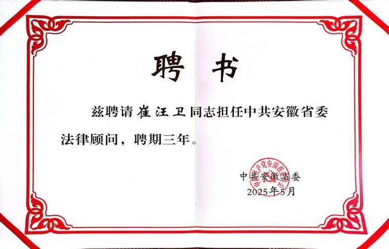 5月30日下午,省委常委会召开全面依法治省委员会第九次会议、省委财经委员会第七次会议。会上聘任9位同志为第四届省委法律顾问,法学院崔汪卫教授被聘为中共安徽省委法律顾问。
