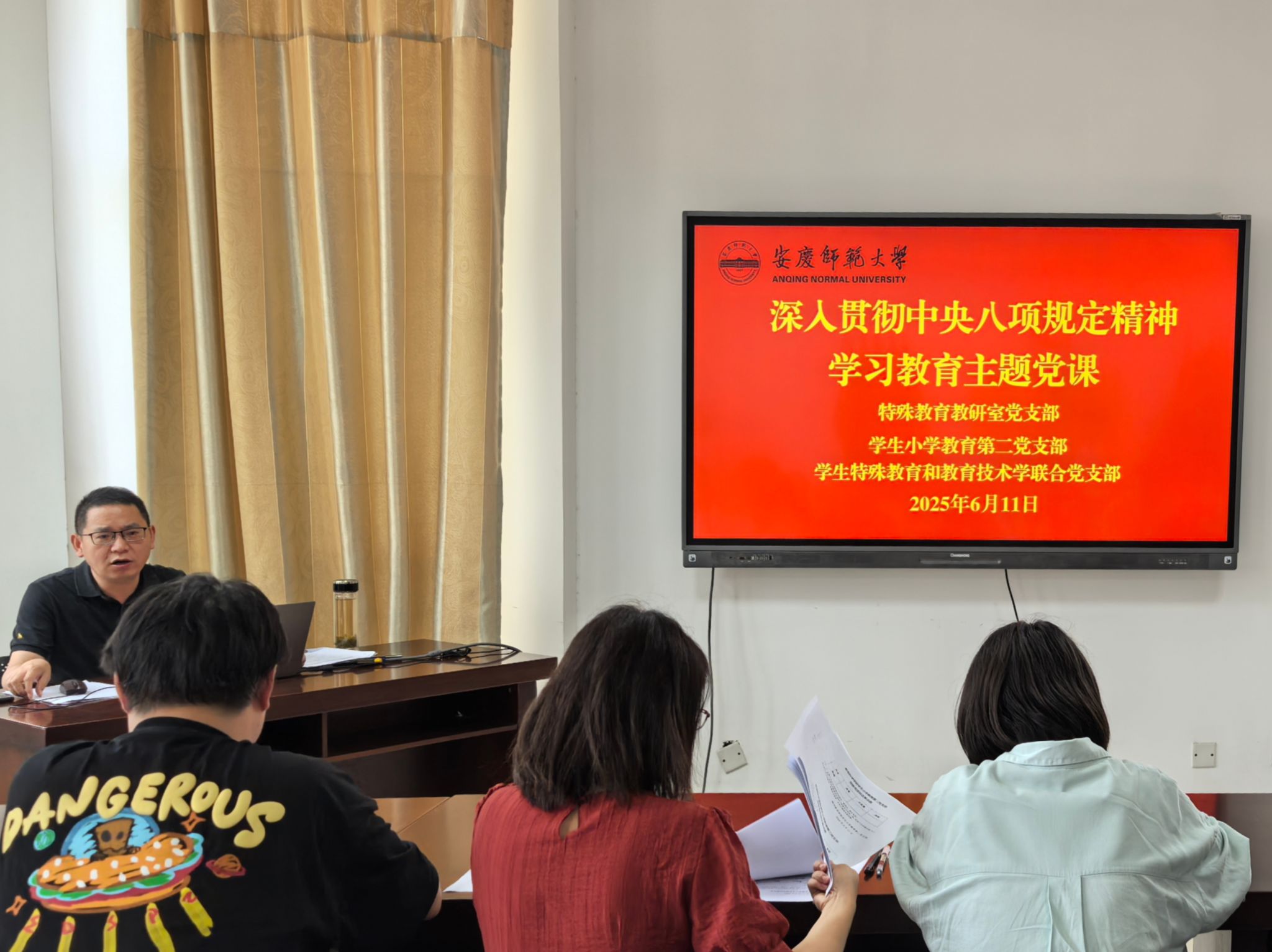 6月11日,教育科学学院党委书记何孔蛟在J202会议室为特殊教育教研室党支部、学生小学教育第二党支部、学生特殊教育和教育技术学联合党支部党员讲授深入贯彻中央八项规定精神学习教育专题党课。