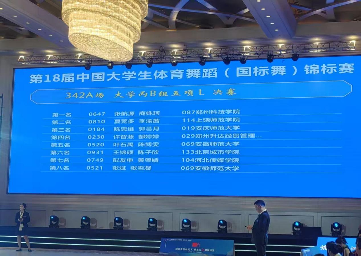 6月9日至12日,第十八届中国大学生体育舞蹈(国标舞)锦标赛在郑州举行。纽约国际官网体育表演专业6名同学参加比赛,共获得3项二等奖(1个第三,2个第四)的优异成绩,其中在艺考表演招生专业最高组别(丙B组)的五项拉丁比赛中取得第三名的骄人战绩,同时也是安徽省高校在本组别上的最好成绩。