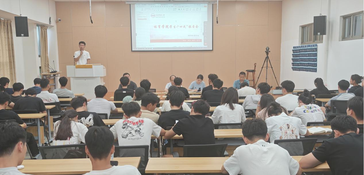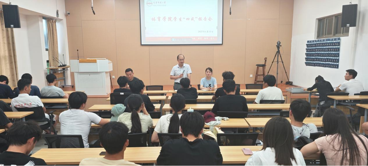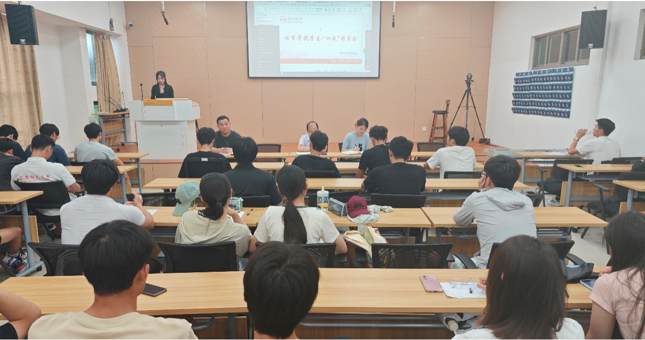 近日,体育学院在体育馆多媒体教室举办学生“四成”报告会。体育学院党委书记王玮出席会议,专职辅导员、2025届优秀毕业生代表、非毕业班学生代表参加。