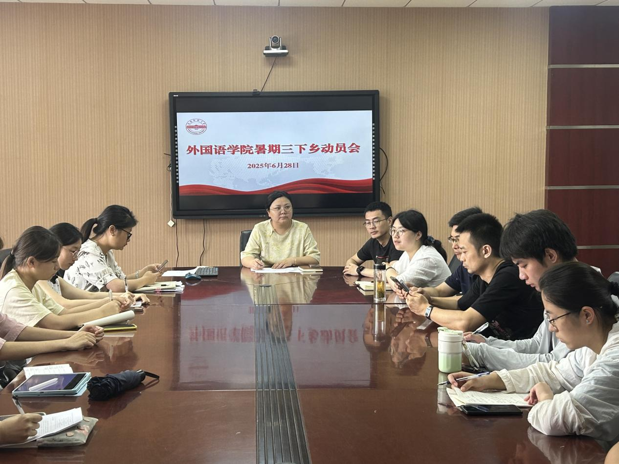 6月24日,外国语学院在E304举行2025年暑期“三下乡”社会实践出征动员大会。外国语学院党委副书记何媛君出席会议并作动员讲话,5支院级重点团队的指导教师及全体团队成员齐聚一堂,为即将启程的社会实践做好充分的思想与行动准备。