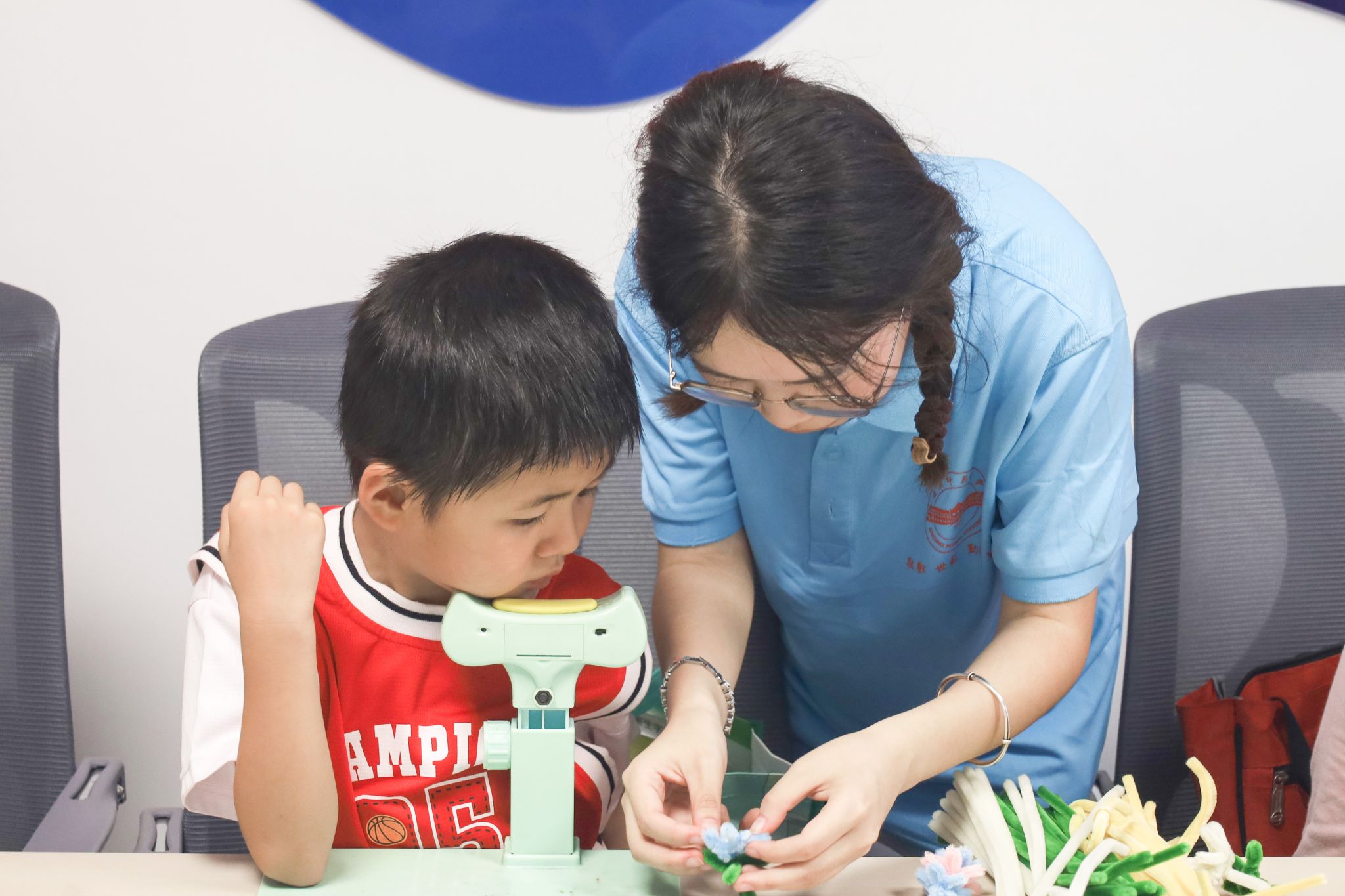 课堂余温未散,活动室已成创意工坊。翻译2023级2班曹心怡担任手工教师,耐心示范用彩色扭扭棒编织莲花。面对“莲花为什么代表廉洁”的童趣提问,她回答道:“莲花出淤泥而不染,廉洁者也能在复杂环境中保持心灵纯洁。”孩子们聚精会神,小手灵活缠绕,一朵朵象征廉洁的“廉花”在指尖悄然绽放。