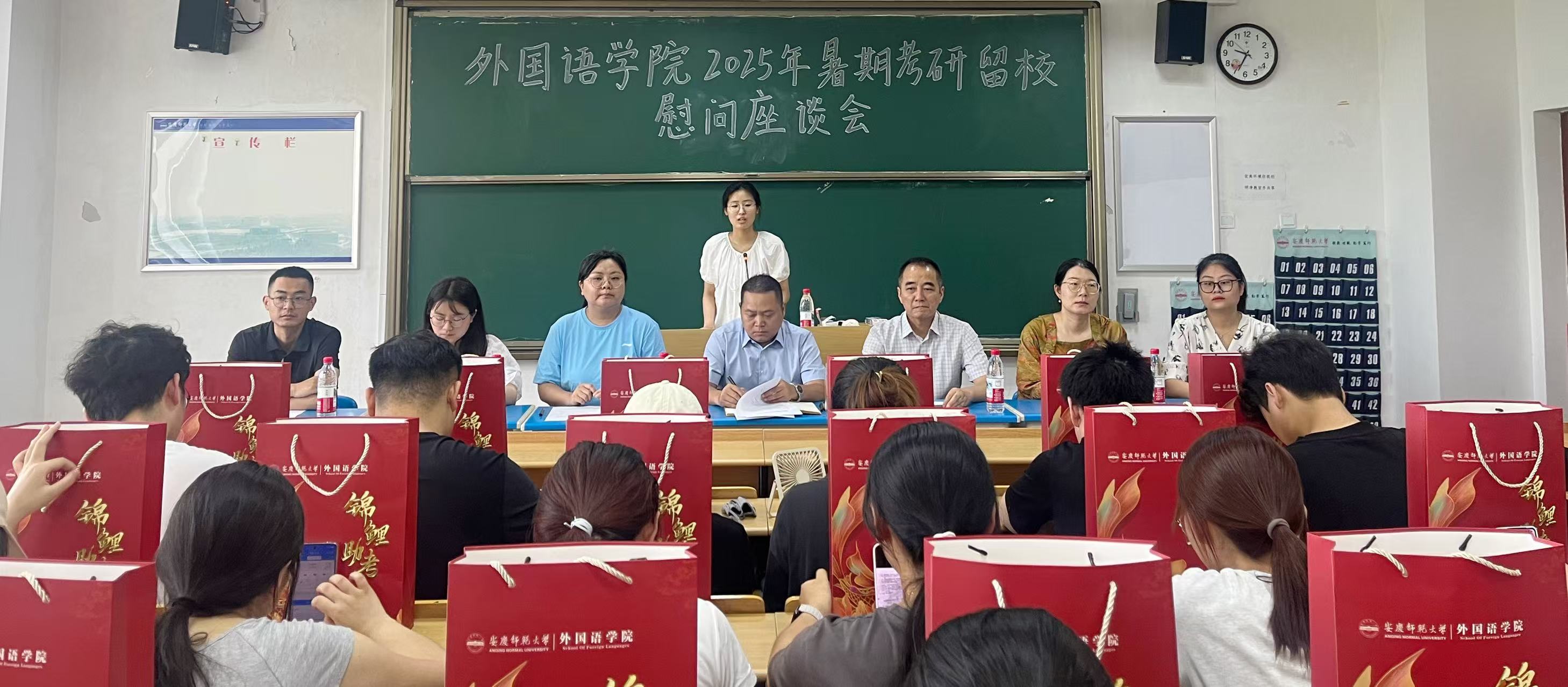 7月30日上午,外国语学院于E314开展2026届暑期留校考研学生慰问活动,外国语学院党委书记徐华胜、院长江加宏、党委副书记何媛君等一行与留校备考学子亲切座谈,并送上暖心慰问品,会议由何媛君主持。