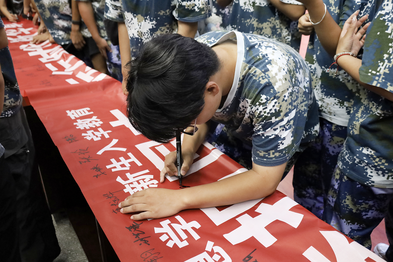 典礼现场,全体师生齐声高唱《歌唱祖国》,鲜艳的五星红旗随歌声轻轻挥舞,澎湃的热血在每个人胸中激荡,浓烈的爱国热情在东报告厅里久久回荡。典礼结束后,2025级新生们纷纷走到“编译青春报国志 运行时代新华章”的红色横幅前,郑重签下自己的名字,将这一意义非凡的时刻深深铭记。