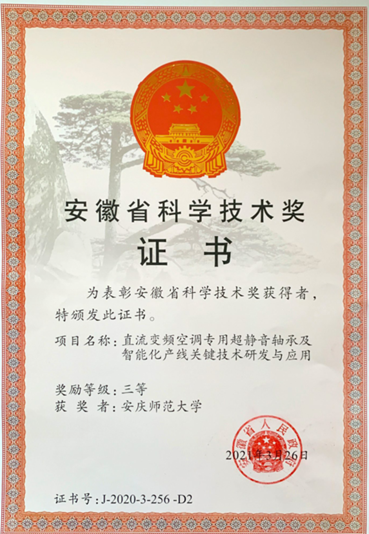 近日,安徽省科学技术奖励暨加快建设科技创新攻坚力量体系推进大会在合肥召开,会上省人民政府公布了《安徽省人民政府关于2020年度安徽省科学技术奖励的决定》(皖政〔2021〕23号)。电子工程与智能制造学院联合申报的研究成果《直流变频空调专用超静音轴承及智能化产线关键技术研发与应用》喜获安徽省科技进步三等奖。