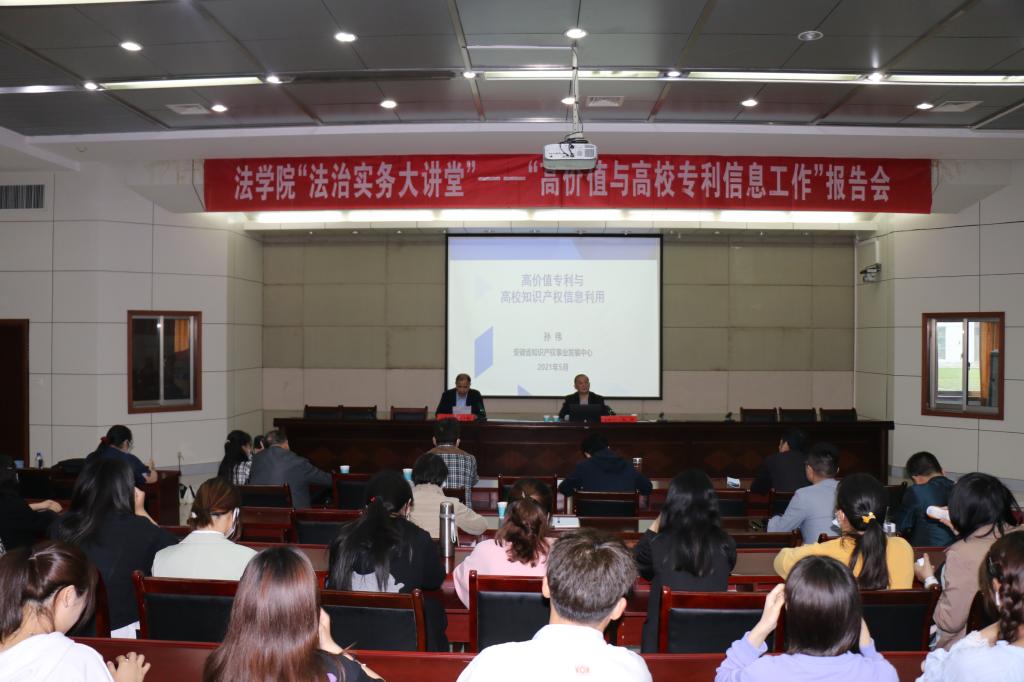 本次报告会是在校五月活动月之际,由校科研处、法学院共同举办的。法学院等师生及安庆市知识产权局部分领导近200人参加了报告会。报告中,孙伟教授对我省高价值专利现状进行了详细的分析,针对高校知识产权管理和高校知识产权信息利用提出建议。随后,孙伟老师从我省高价值专利数量排名情况、各市发明专利对比情况、安庆市申请专利数量以及纽约国际官网专利数量等方面对我省高价值专利现状进行了详细的分析;最后,孙伟老师针对高校知识产权信息利用提出了加快建立职务科技成果披露制度、提升专业化服务能力、大力提倡通过普通许可方式开展科技成果转化等建议。