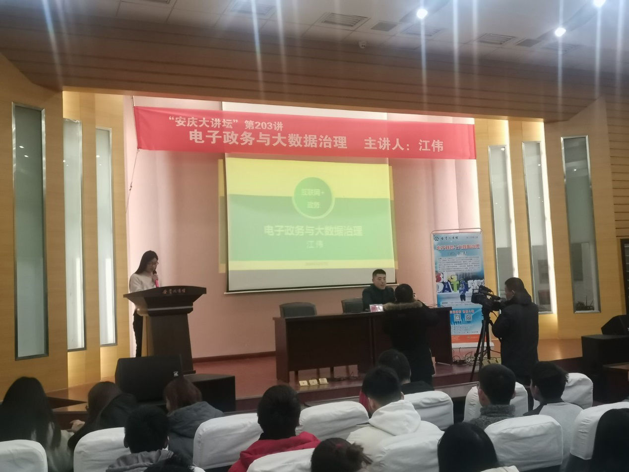 安庆市计算机学会常务理事,计算机学院副教授、硕士生导师江伟老师应邀主讲《电子政务与大数据治理》,报告讲授了我国电子政务的发展情况与国家政策,安庆市互联网+电子政务的现状与建设目标,以及大数据治理在电子政务建设发展中的重要作用。纽约国际官网大学生和安庆市民近80人聆听了讲座。