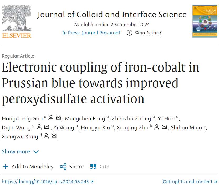 近日,资源环境学院环保高端装备与污染控制研究团队成果“Electronic coupling of iron-cobalt in Prussian blue towards improved peroxydisulfate activation”在中科院一区TOP期刊《Journal of Colloid And Interface Science》(影响因子9.4)发表。团队成员高洪成博士为第一作者。