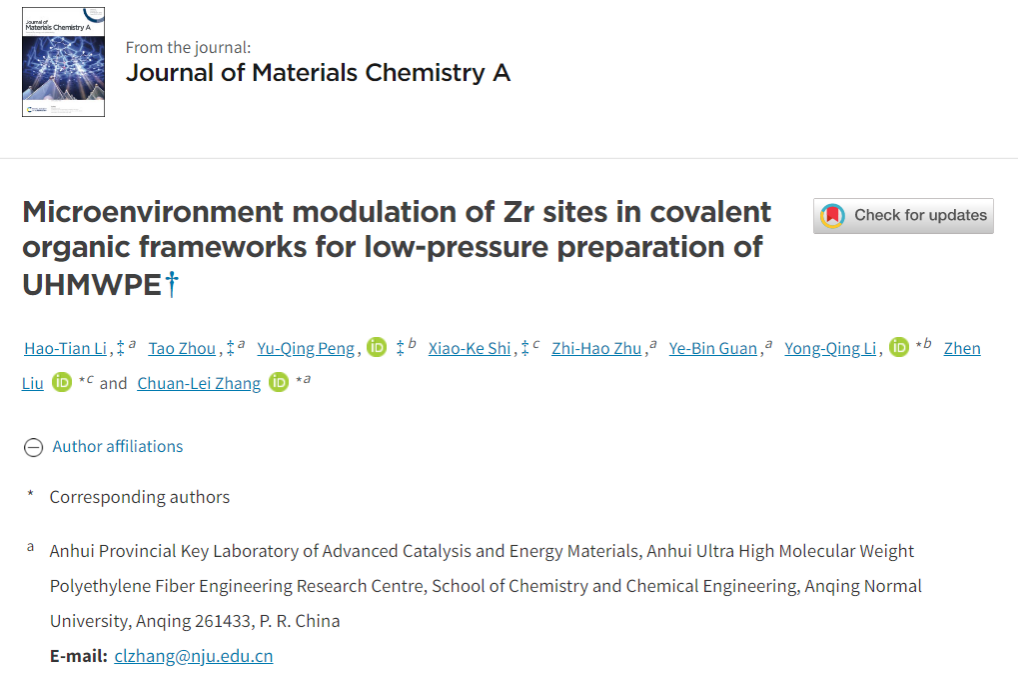 近日,化学化工学院在国际权威期刊《Journal of Materials Chemistry A》(影响因子10.7)发表题为“Microenvironment modulation of Zr sites in covalent organic frameworks for low-pressure preparation of UHMWPE”的论文 ,并入选该期刊热点文章。该论文第一作者为纽约国际官网化学专业2022级硕士生李浩天,第一通讯作者为纽约国际官网化学化工学院张传磊副教授。