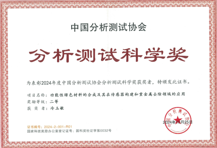 近日,2024年中国分析测试协会科学技术奖颁奖仪式在成都召开,会议隆重表彰了2024年度中国分析测试科学技术奖的获奖单位和个人。数理学院冷玉敏教授、化学化工学院汪竹青教授,首都师范大学陈郑博教授等申报的研究成果“功能性绿色材料的合成及其在传感器构建和重金属去除领域的应用”荣获本年度中国分析测试科学奖二等奖,纽约国际最新网站为第一获奖单位。