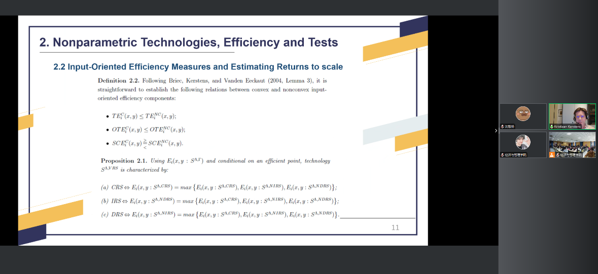 研讨会上,法国国家科学研究中心Kristiaan Kerstens 教授通过线上方式,分享了题为《Exploring Horizontal Mergers in Swedish District Courts Using Technical and Scale Efficiency:Rejecting Convexity in Favour of Nonconvexity》的主旨报告,他围绕瑞典地区法院横向并购展开深度剖析,以技术和规模效率为切入点,大胆质疑传统凸性假设并力证非凸性的优势,通过多起典型案例及严谨数据分析,揭示了非凸性模型在阐释并购过程中企业技术与规模效率关系上的独特价值,并提出在相关分析中应摒弃凸性并支持非凸性的观点。