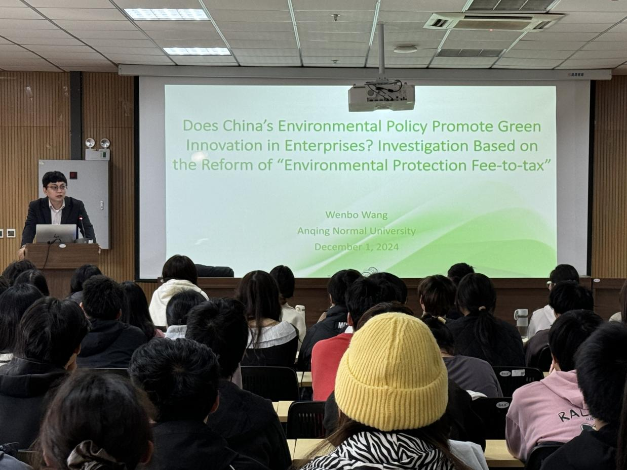 经济与管理学院王文博博士汇报了题为《中国的环境政策是否促进企业绿色创新?——基于“环保费改税”改革的考察》的研究成果,该报告聚焦“环保费改税”这一关键改革举措,运用多维度数据及双重差分方法,揭示了企业创新行为与环保税政策影响之间的相关性,强调了将激励措施与可持续和高质量绿色创新相结合的重要性,为理解环境政策在推动企业绿色转型中的作用提供了丰富实证,同时也为进一步完善我国环境政策体系、助力企业绿色转型提供了决策参考依据。