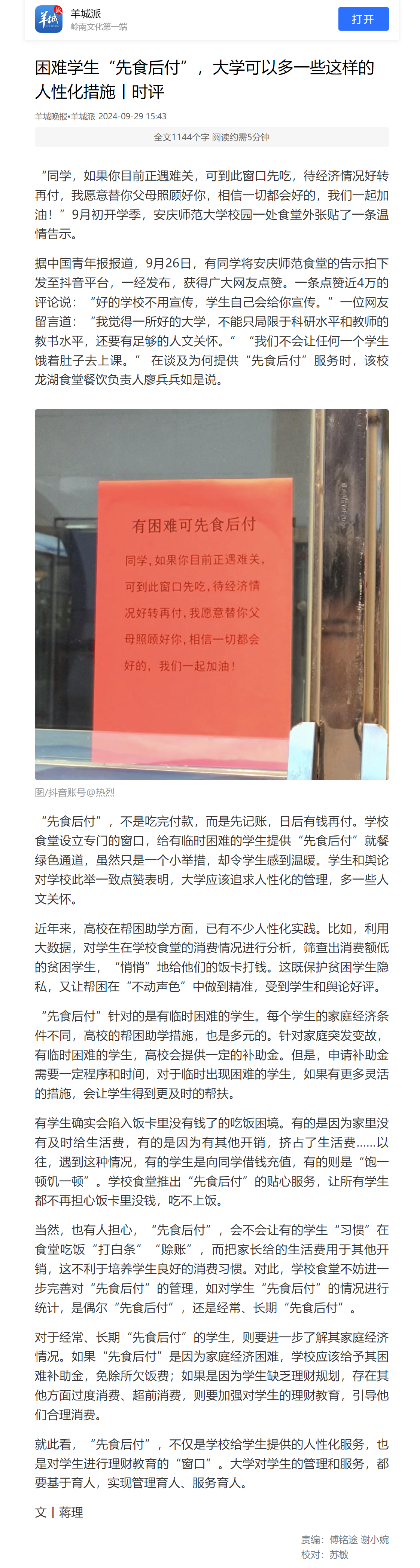 上一篇:中国青年报客户端:一高校食堂为困难学生提供“先食后付” 获点赞
