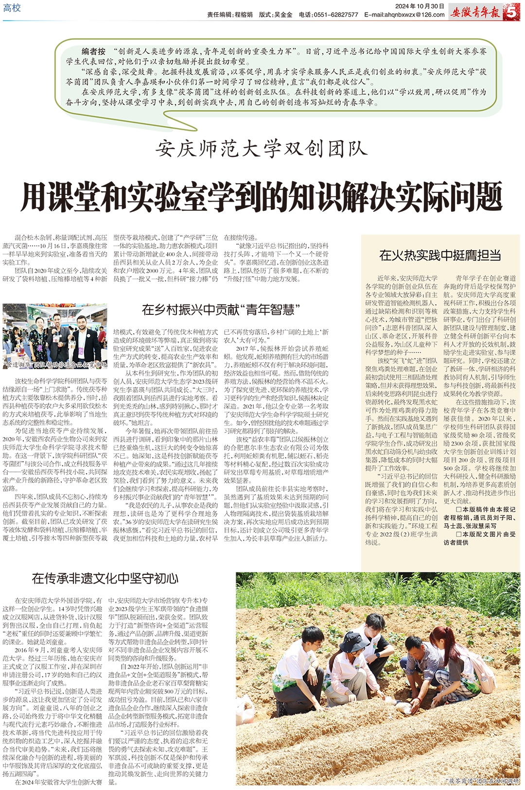 今年暑假,她再次带领团队前往岳西县进行调研,看到印象中的那片山林已经重焕生机,这巨大的转变令她惊喜不已。她深知,这是科技创新赋能茯苓种植产业带来的成果。“通过这几年接续地攻克技术难关,农民实现增收,扬起了笑脸,我们看到了努力的意义。未来我们会继续学习和探索,提高科研能力,为乡村振兴事业贡献我们的‘青年智慧’”。