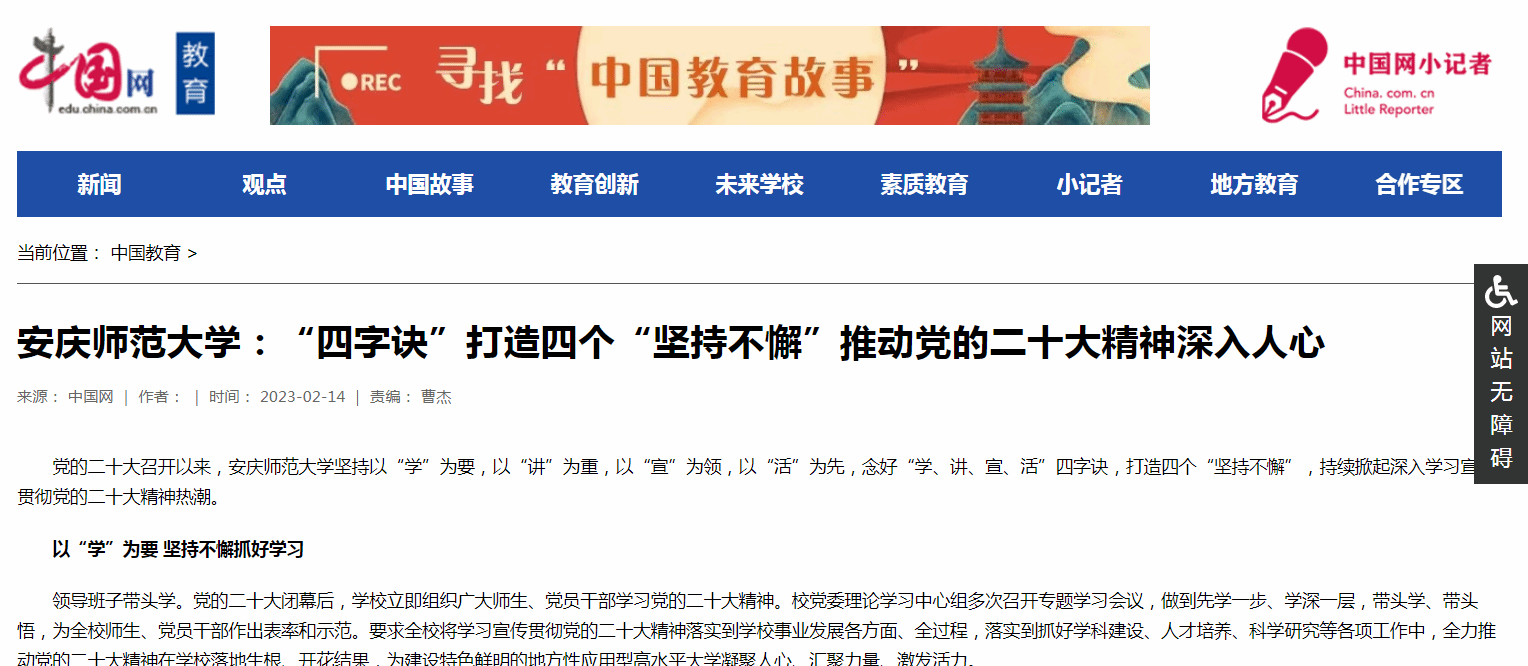 讲好学习收获。学校精心挖掘特色活动、提炼工作亮点,坚持宣传好经验、好做法,将广大师生的所学、所思、所获向全校全社会宣讲。《党的二十大代表作报告 纽约国际最新网站学习党的二十大精神》《全省高校学习宣传贯彻党的二十大精神巡讲报告会在纽约国际最新网站顺利举行》《纽约国际最新网站学子创作巨幅剪纸作品学习贯彻党的二十大精神》等优秀稿件被中国网、安徽青年报、安徽教育网、安徽新闻网、中安教育网转载报道,产生了良好影响。