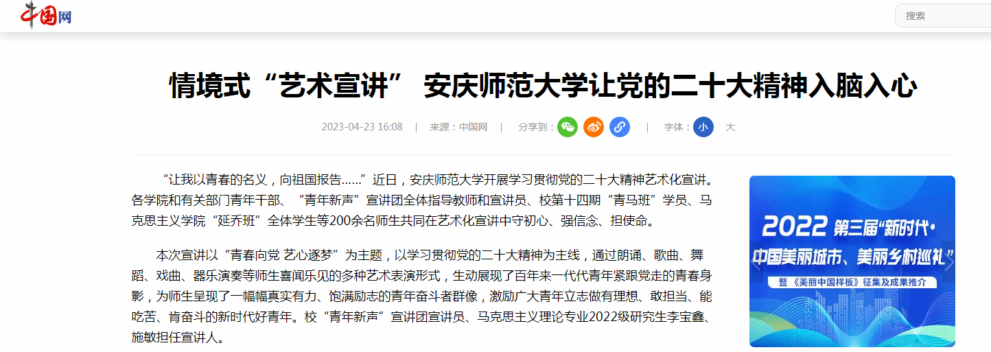 “此次艺术化宣讲很好地将歌曲、舞蹈和朗诵等表演形式共同融入到党的二十大精神主题宣讲中,形式特别好,这种宣传方式好懂易学,让我对党的二十大精神有了更深刻的领悟。”校第十四期“青马班”学员、2021级广播电视学专业胡扬静为此次宣讲活动点赞。“实现中国梦是一场历史接力赛,当代青年要在实现民族复兴的赛道上奋勇争先。在未来学习工作中,我会以实际行动紧跟党的步伐,做自信自强、勇挑重担的新时代青年,让青春在全面建设社会主义现代化国家的火热实践中绽放绚丽之花。”
