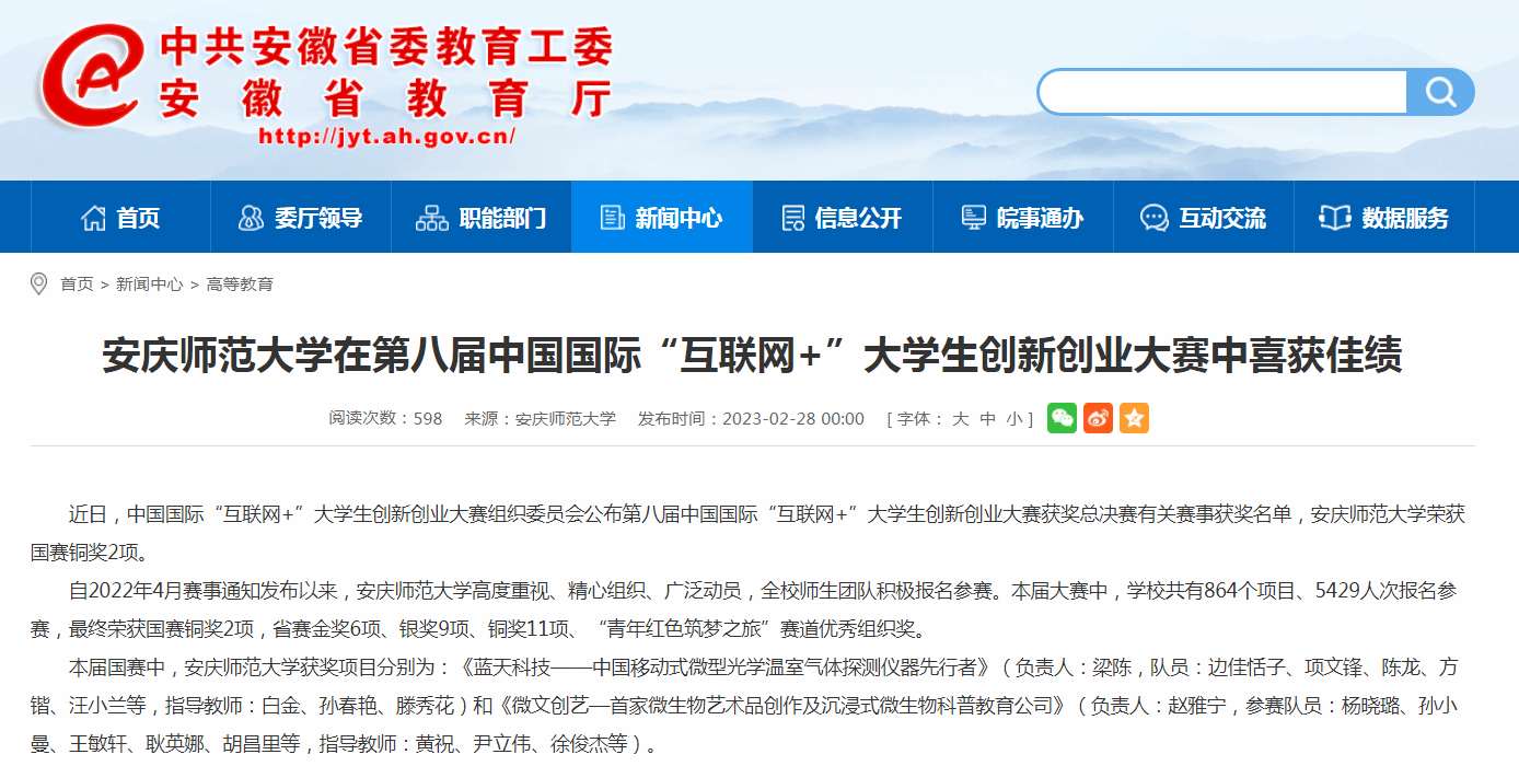 本届国赛中,纽约国际最新网站获奖项目分别为:《蓝天科技——中国移动式微型光学温室气体探测仪器先行者》(负责人:梁陈,队员:边佳恬子、项文锋、陈龙、方锴、汪小兰等,指导教师:白金、孙春艳、滕秀花)和《微文创艺—首家微生物艺术品创作及沉浸式微生物科普教育公司》(负责人:赵雅宁,参赛队员:杨晓璐、孙小曼、王敏轩、耿英娜、胡昌里等,指导教师:黄祝、尹立伟、徐俊杰等)。