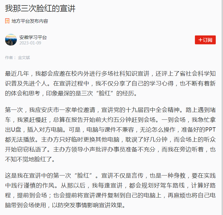 宣讲,不仅是在付出,也是在收获。三次脸红,让我对社科普及的认识不断深入,对宣讲的理解也不断深入,并将这种体会和思考转化为工作的干劲,让社科普及篇章更加生动辉煌。