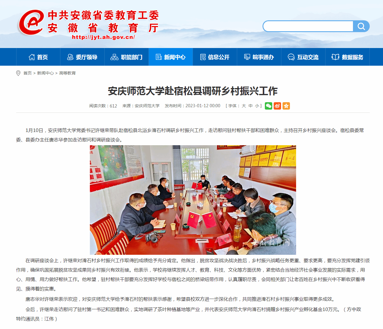 在调研座谈会上,许继荣对滑石村乡村振兴工作取得的成绩给予充分肯定。他指出,脱贫攻坚战决战决胜后,乡村振兴战略任务更重、要求更高,要充分发挥党建引领作用,确保巩固拓展脱贫攻坚成果同乡村振兴有效衔接。他表示,学校将继续发挥人才、教育、科技、文化等方面优势,紧密结合当地经济社会事业发展的实际需求,用心、用情、用力做好帮扶工作。他希望,驻村帮扶干部要充分发挥好学校与宿松之间的桥梁纽带作用,认真履职尽责,会同相关部门让老百姓在乡村振兴中不断收获看得见、摸得着的实惠。