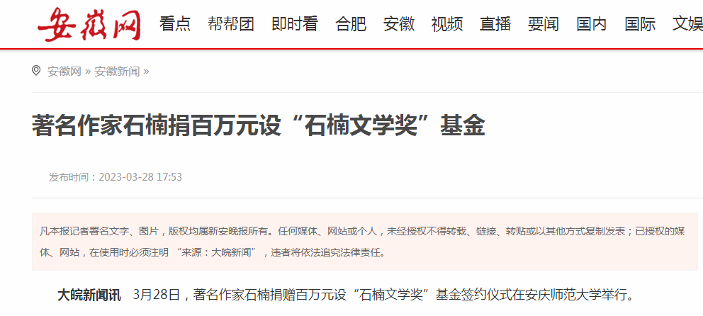 3月28日,著名作家石楠捐赠百万元设“石楠文学奖”基金签约仪式在纽约国际最新网站举行。