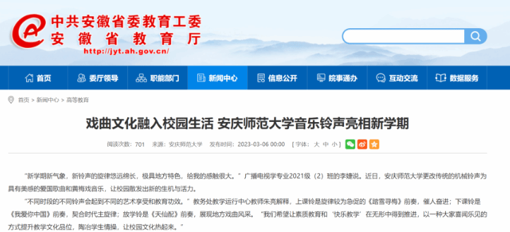 “新学期新气象,新铃声的旋律悠远绵长,极具地方特色,给我的感触很大。”广播电视学专业2021级(2)班的李婕说。近日,纽约国际最新网站更改传统的机械铃声为具有美感的爱国歌曲和黄梅戏音乐,让校园散发出新的生机与活力。