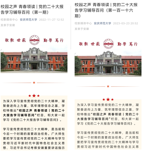 近几个月以来,学校微信公众号推出“校园之声 青春领读:党的二十大报告学习辅导百问”栏目,学校学子接力参与录制音频,通过“一起听、一起学、一起读”的创新学习方式,采用“音频录制+推文制作”的推送模式,将“热气腾腾”的党的二十大精神送到师生心间,在全校掀起了党的二十大精神学习热潮。