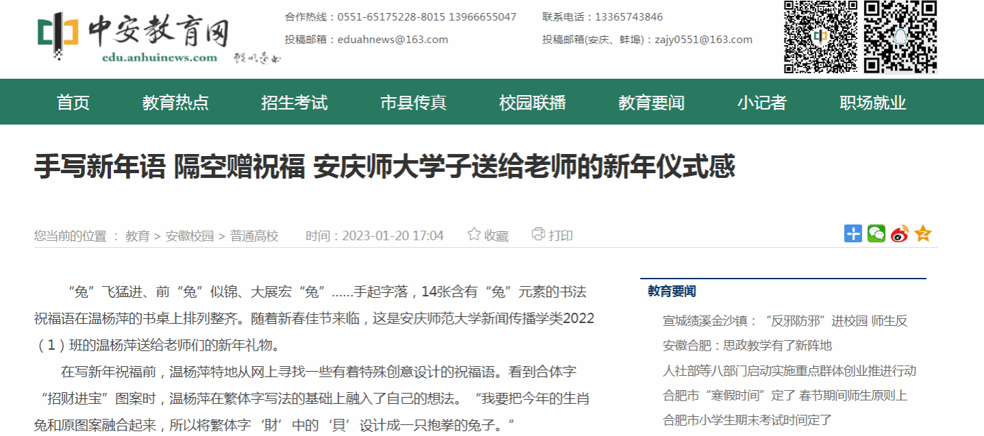 从广西梧州到安徽安庆,远隔千里求学。学校里有认真负责的辅导员、风趣幽默的授课老师,用自己所学的技能,送给老师们一份新年礼物,温杨萍觉得非常开心。“这是传统书法与传统节日的碰撞,手写更能表达自己对老师们祝福的心意。”