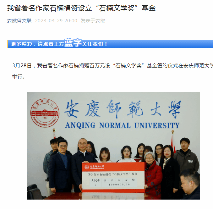 在签约仪式上,石楠回顾了她的创作历程,介绍了她捐资设立文学奖基金的初衷。她表示,“是书籍和生活营养了我,是文学滋润丰富了我的心灵,在我人生的秋天,幸逢盛世,让我能拿起笔抒写生活和人生。是文学改变了我的命运。在我七十七岁最后一部长篇小说《一边奋斗一边爱》出版的时候,我觉得我的生活写完了,宣布不再写长篇。我就在想,我还能为文学做点什么。就想到我的那点稿费,想让它为文学出点力。”