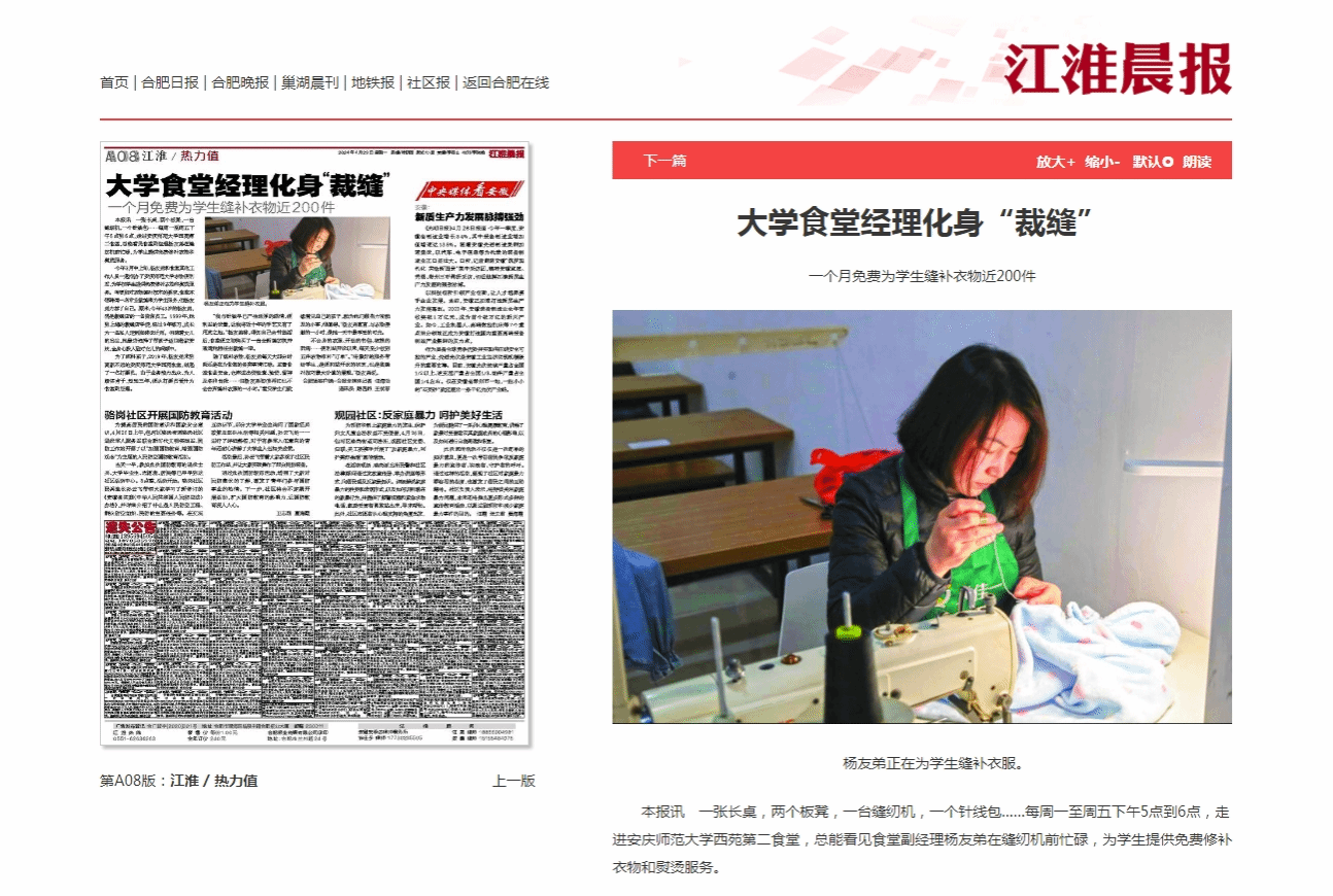 今年3月中上旬,杨友弟和食堂其他工作人员一起创办了纽约国际最新网站衣物便利站,为学校学生提供免费修补衣物和熨烫服务。考虑到对衣物缝补技术的要求,食堂本想聘请一名专业裁缝来为学生服务,但杨友弟力荐了自己。原来,今年43岁的杨友弟,曾是裁缝店的一名资深员工。1999年,她到上海的裁缝店学徒,经过9年练习,成长为一名私人定制服装设计师。但随着女儿的出生,她最终选择了带孩子返回老家安庆,全身心投入到对女儿的照顾中。