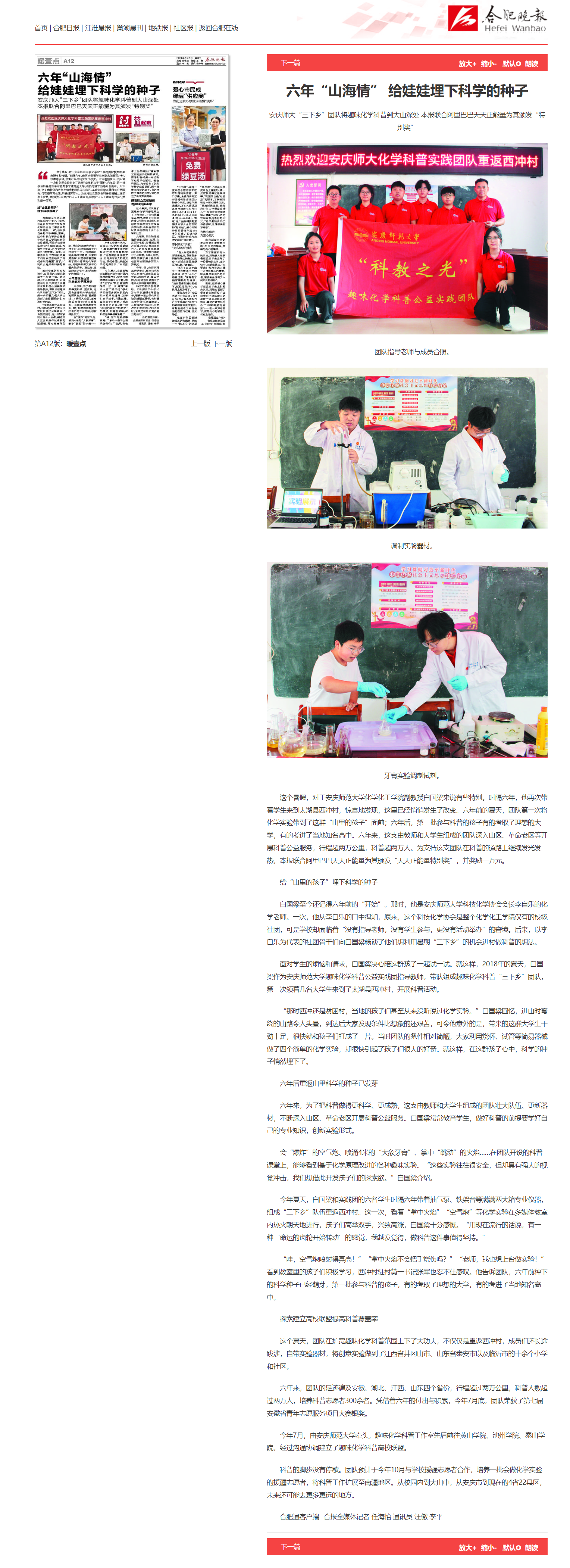 这个暑假,对于纽约国际最新网站化学化工学院副教授白国梁来说有些特别。时隔六年,他再次带着学生来到太湖县西冲村,惊喜地发现,这里已经悄悄发生了改变。六年前的夏天,团队第一次将化学实验带到了这群“山里的孩子”面前;六年后,第一批参与科普的孩子有的考取了理想的大学,有的考进了当地知名高中。六年来,这支由教师和大学生组成的团队深入山区、革命老区等开展科普公益服务,行程超两万公里,科普超两万人。为支持这支团队在科普的道路上继续发光发热,本报联合阿里巴巴天天正能量为其颁发“天天正能量特别奖”,并奖励一万元。