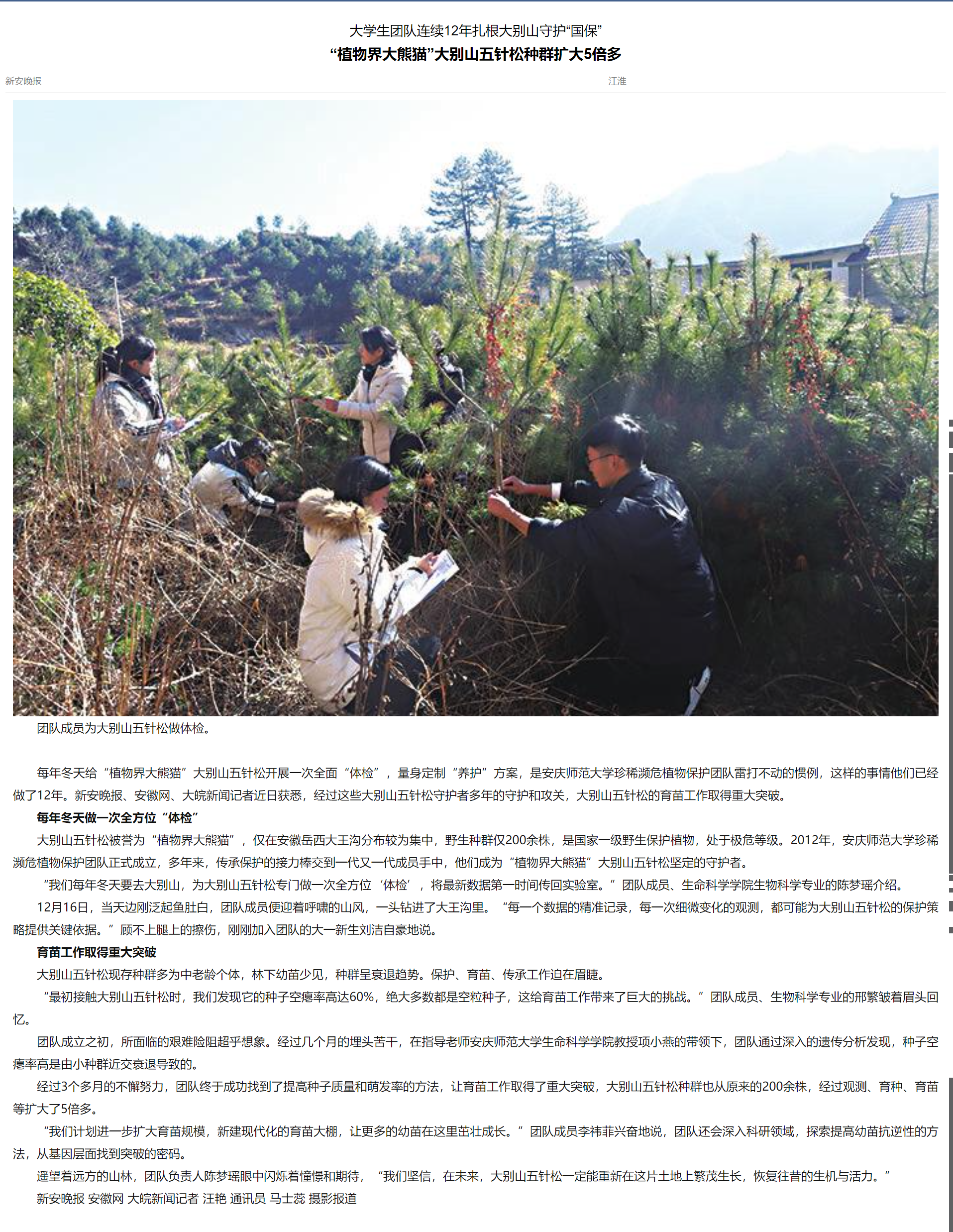 下一篇:安徽青年报:扎根大别山12年守护“植物界大熊猫”