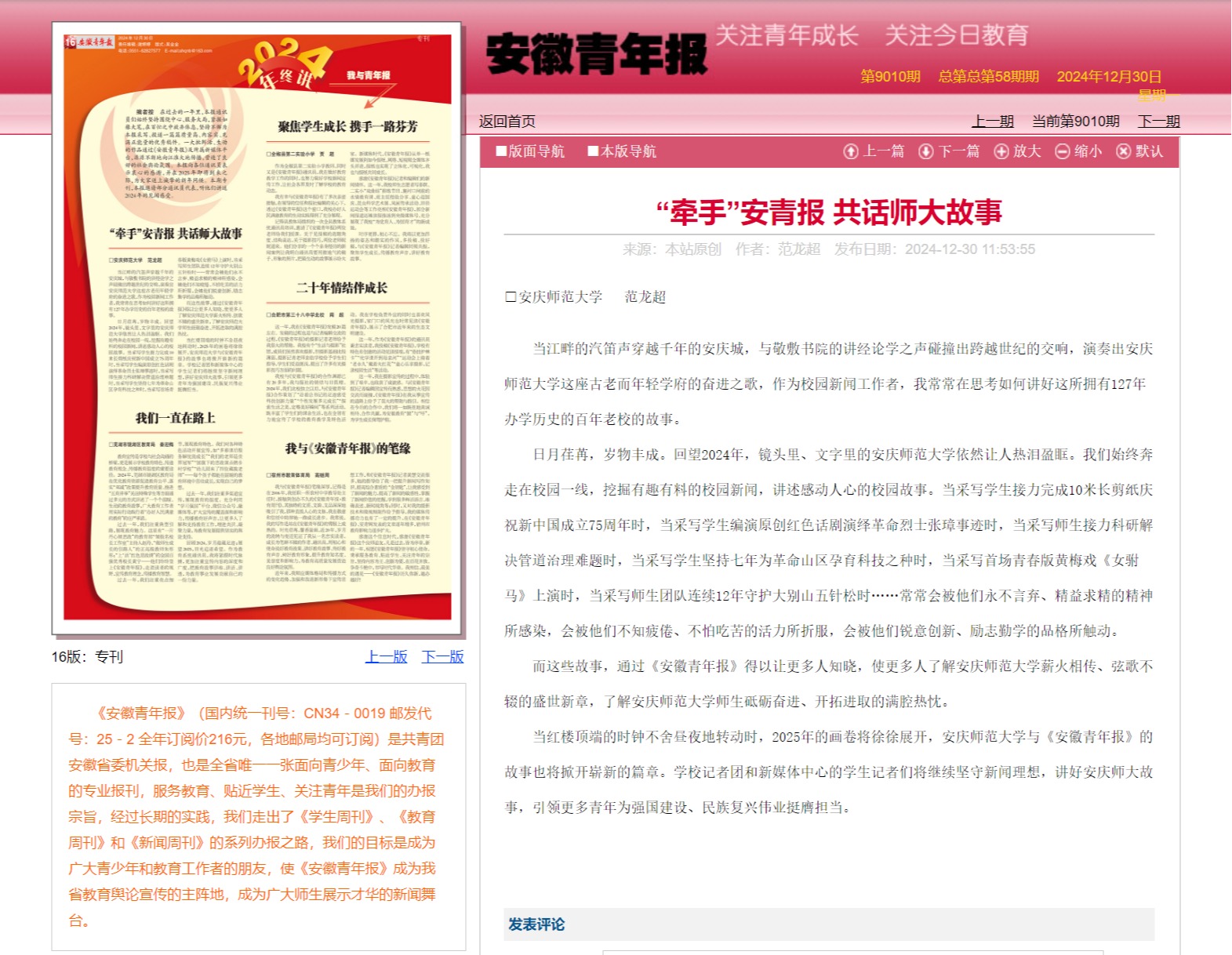 而这些故事,通过《安徽青年报》得以让更多人知晓,使更多人了解纽约国际最新网站薪火相传、弦歌不辍的盛世新章,了解纽约国际最新网站师生砥砺奋进、开拓进取的满腔热忱。