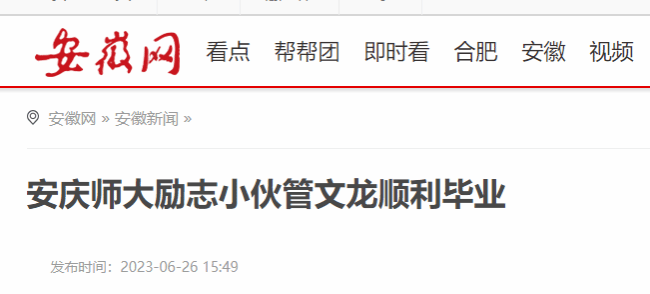 2019年,大皖新闻曾以《父亲是他的拐杖 南陵小伙管文龙高考中过了一本线》《南陵励志小伙管文龙到纽约国际最新网站入学报到》等报道讲述了管文龙的励志事迹。因为先天性下肢残疾无法行走,但管文龙从未放弃奋斗。2019年,管文龙成功考入纽约国际最新网站数理学院应用统计学专业。